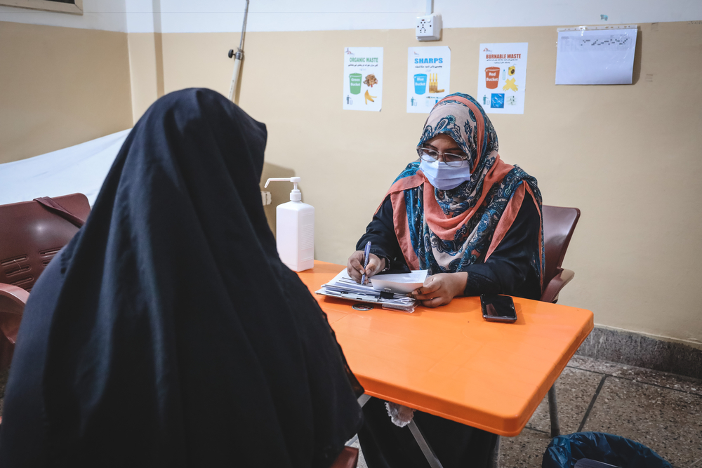 La zona de mujeres es más tranquila, está más en calma. A una paciente vestida de negro y dorado le toman la presión arterial, mientras que el pañuelo rosa de la doctora brilla bajo la luz artificial. Otras mujeres esperan afuera, bajo el zumbido de los ventiladores, el aire cálido que sopla por el pasillo lo convierte en un túnel de viento. Hasta ahora, el número de mujeres que acuden a vacunarse contra la COVID-19 es mucho menor que el de los hombres, pero las promotoras de salud de MSF intentan revertir esta situación. Se mueven entre las mujeres hablándoles sobre sus miedos y preocupaciones, respondiendo a sus preguntas sobre los efectos secundarios o cómo proteger al resto de su familia del virus.