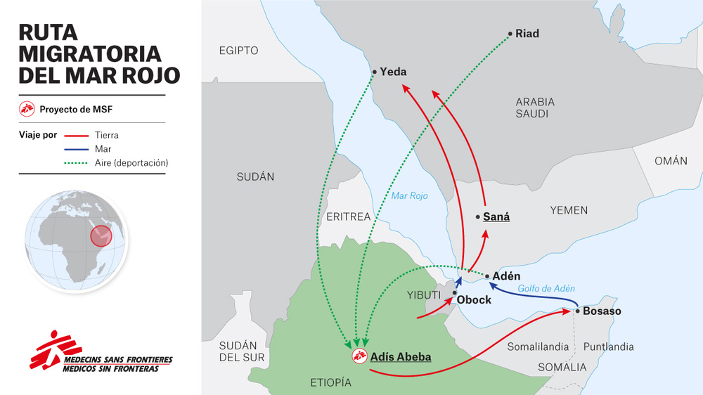 Por lo general, las personas que migran atraviesan Yibuti o Somalilandia a pie, y luego cruzan el mar Rojo hasta la costa de Yemen. Atraviesan un país en guerra para llegar a la frontera de Arabia Saudita. En el camino, muchas se quedan varadas en Yemen o son capturadas por traficantes que extorsionan a sus familias. Las que consiguen llegar a Arabia Saudita suelen ser víctimas de la violencia y los malos tratos. Desde 2017, Arabia Saudita detiene a aquellas personas que no tienen documentación y las recluye en condiciones antihigiénicas y de hacinamiento hasta que las deporta a sus países de origen. Antes de la pandemia, las autoridades de Arabia Saudita deportaban aproximadamente 10,000 personas de Etiopía cada mes.
