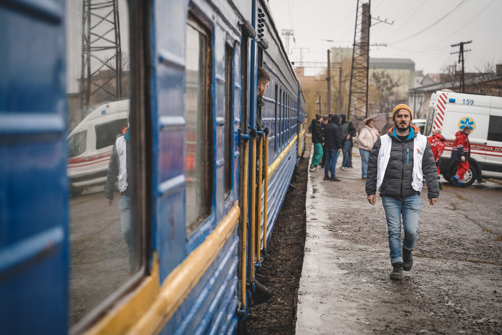 El 1 de abril, Médicos Sin Fronteras completamos nuestro primer traslado en el tren de medicalizado, trasladando a nueve pacientes heridos en Mariúpol o sus alrededores desde hospitales en Zaporizhzhia a hospitales en Leópolis, transportándoles en un tren de dos vagones equipado como una sala de hospitalización básica, con un equipo de nueve médicos de MSF a bordo.