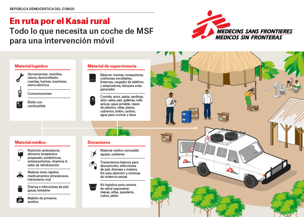 En la provincia de Kasai de la República Democrática del Congo, Médicos sin Fronteras (MSF) envía equipos móviles en todoterrenos a las zonas rurales para llegar a las poblaciones más remotas e inaccesibles. Una vez allí, el objetivo es restablecer la funcionalidad del sistema de salud que se ha visto muy afectado por la violencia ocurrida en el último año.