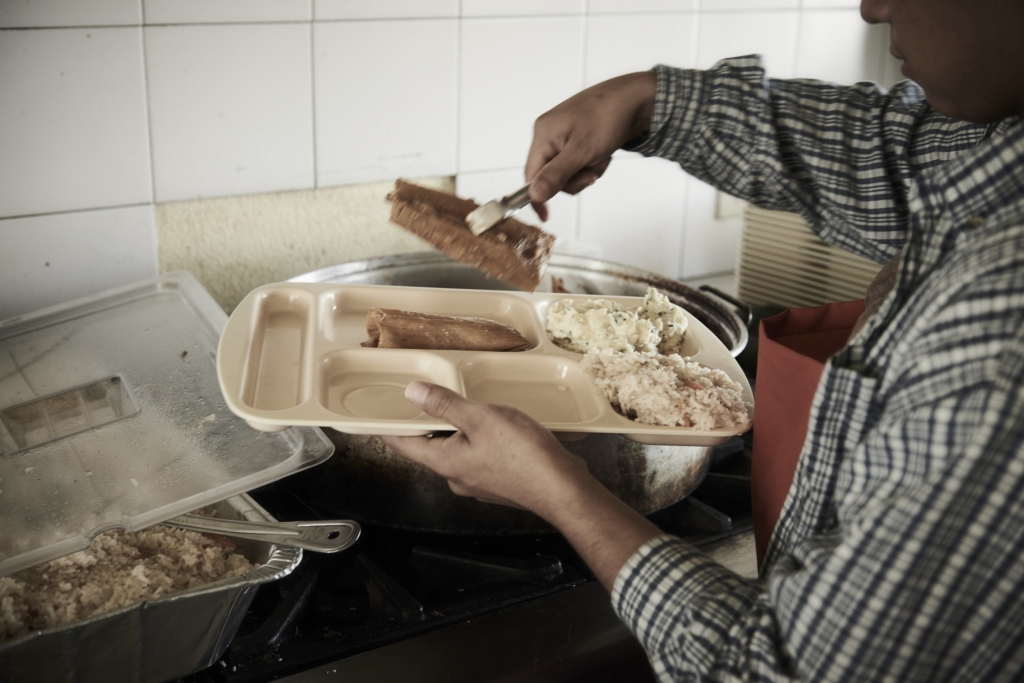 Cocinar en el albergue le ha ayudado a mejorar su ánimo. Dice que es una de sus aficiones y que le gustaría tener su propio negocio. El menú de hoy es: arroz blanco, tamal y frijol. Cuando le piden un poco más, él les da una ración generosa. Después de terminar de servir, se limpia las manos y continúa. “Es que nos han pasado muchas cosas. Yo todavía no puedo entender cómo llegué hasta acá. Los primeros días fueron duros, estaba triste y no sabía qué hacer. Me sentía encerrado. Entonces se me ocurrió ayudar a preparar los platos. Ahora me encargo de hacer la comida para todos y de servirles”.