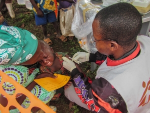 Personal de MSF distribuye material básico entre la población para prevenir las infecciones. Constan de cloro, jabón, guantes, buzos, bolsas de basura, gafas y mascarillas. Ya se han entregado 50.000 en Liberia y el objetivo es llegar a las 245.000 personas