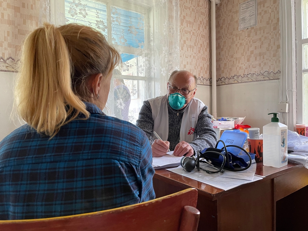 “Lack of medication is an issue. Villagers cannot continue to treat their conditions, and many of them have not seen a doctor for a long time.” Valerii Gontarenko, médico de MSF, en una clínica móvil en Ucrania. Mayo 2022 ©Signe Damgaard/MSF