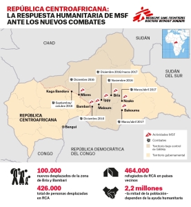 En la República Centroafricana MSF trabaja en 21 proyectos en 17 poblaciones, cinco de los cuales son en la capital, Bangui. Hay que sumar además la labor con los refugiados centroafricanos en los ocho campos de Camerún, Chad y República Democrática del Congo.